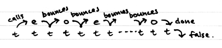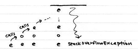 Here's a picture of a Scala program as it executes. This program tries to work out whether 9999 is even or odd by calling odd1 and even1 recursively. The stack overflows before we can make 9999 calls.